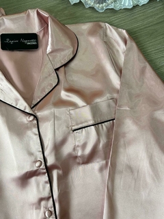 Pijama delicado em seda, blusa de manga comprida com botões na frente, com calça comprida.